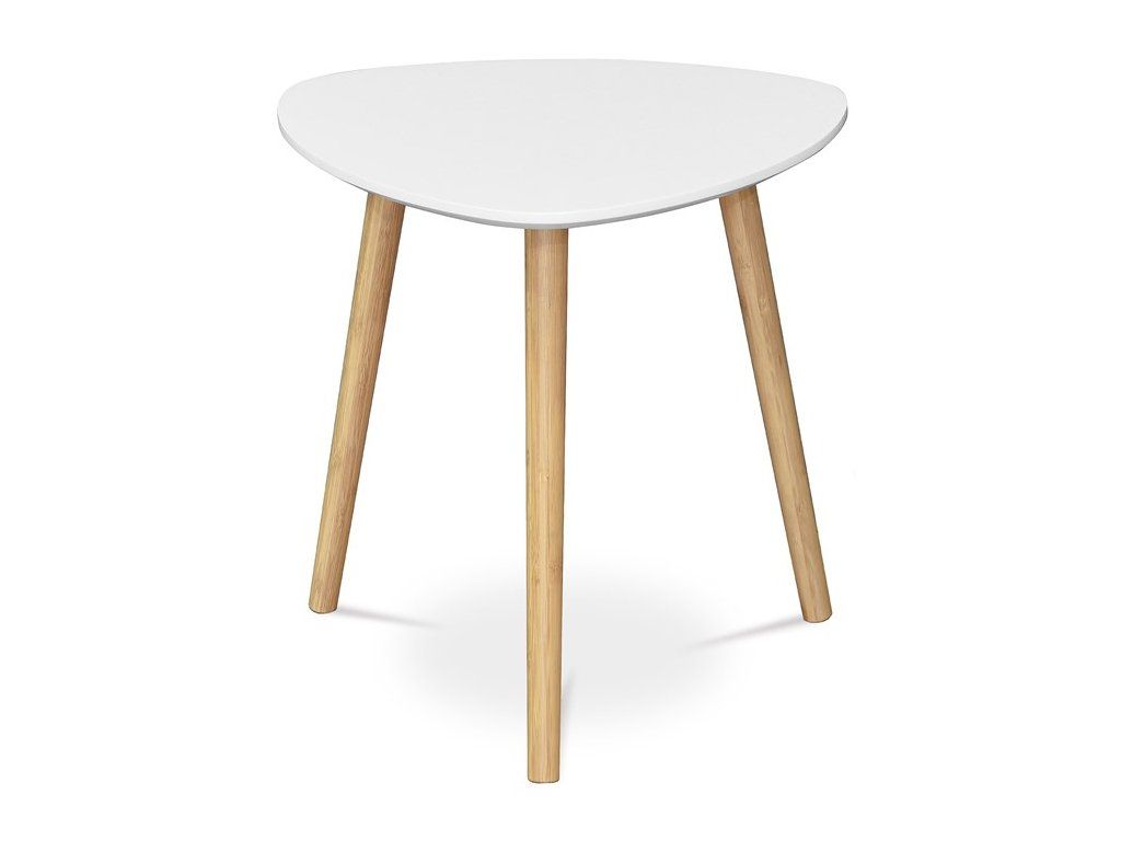 Stabilitu zabezpečuje trojnohá konštrukcia z masívneho bambusu, ktorý je známy svojou pevnosťou a ekologickým charakterom. Prírodný hnedý odtieň nôh vytvára príjemný kontrast k bielej doske a dodáva stolíku prirodzený, teplý vzhľad.