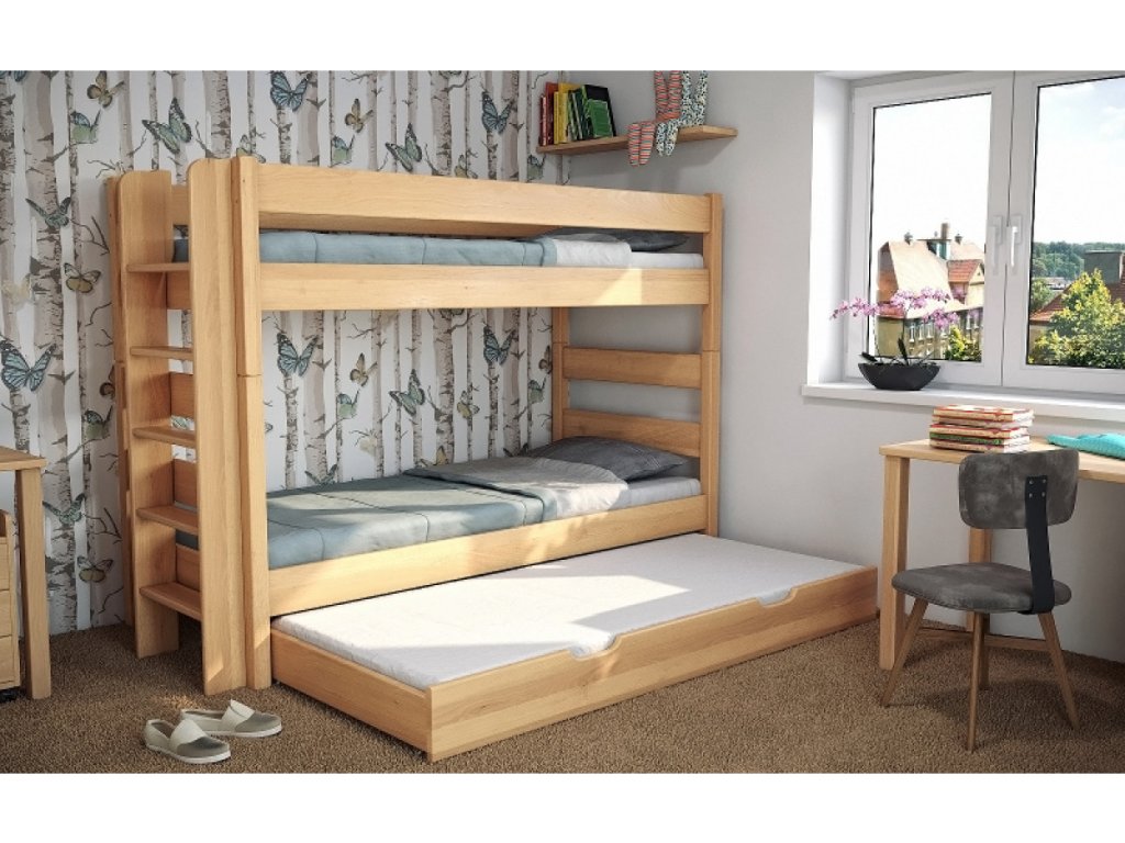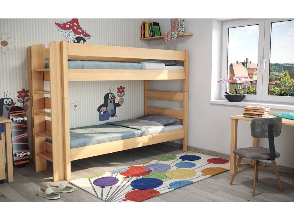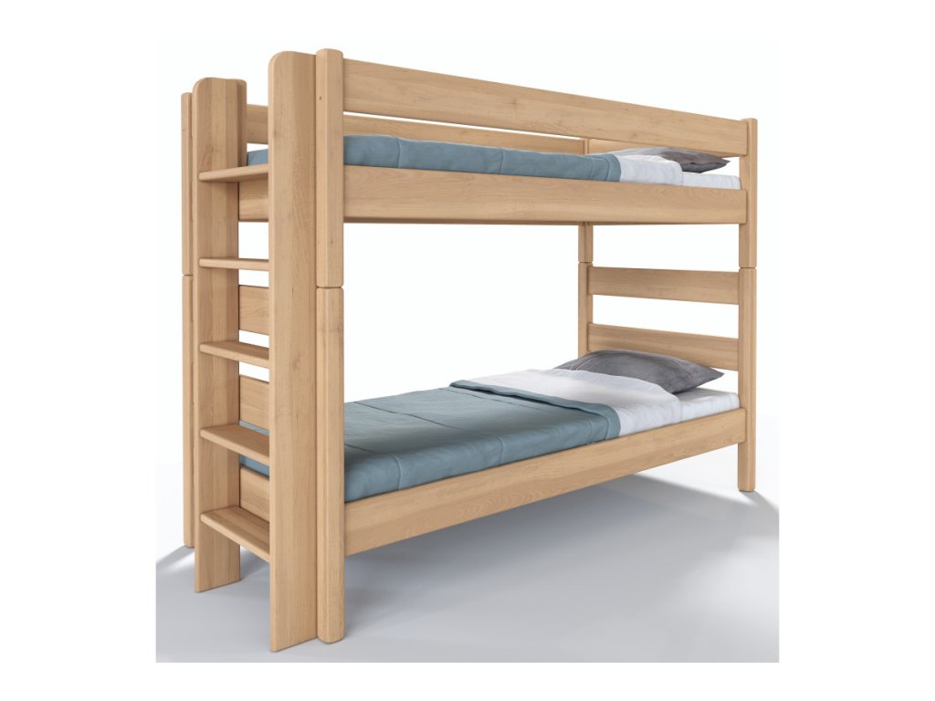 Hľadáte spoľahlivú a priestorovo úspornú posteľ pre dve deti? Model Junior 3 z masívneho buka je ideálnou voľbou do súrodeneckých izieb, kde je dôležitá stabilita, bezpečnosť a dlhá životnosť. Vďaka jednoduchému tvaru a rebríku umiestnenému zboku postele šetrí miesto a zároveň umožňuje pohodlný prístup na horné lôžko.