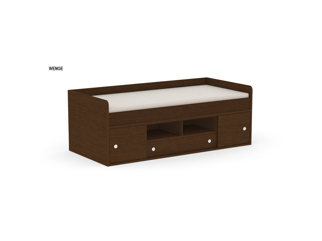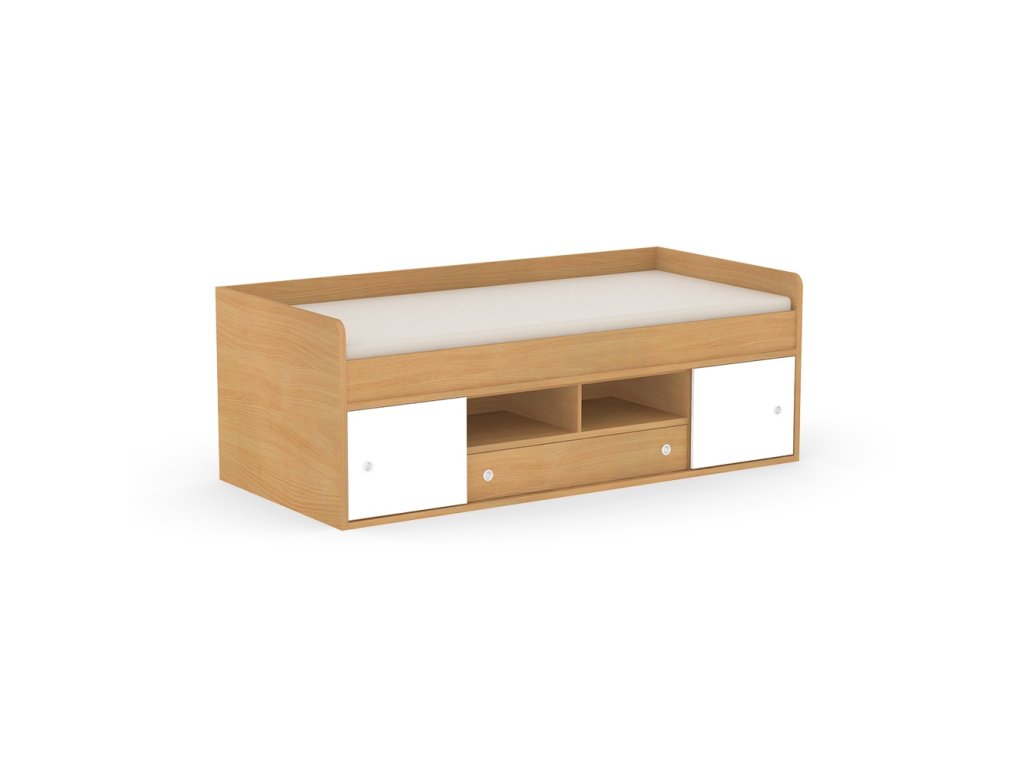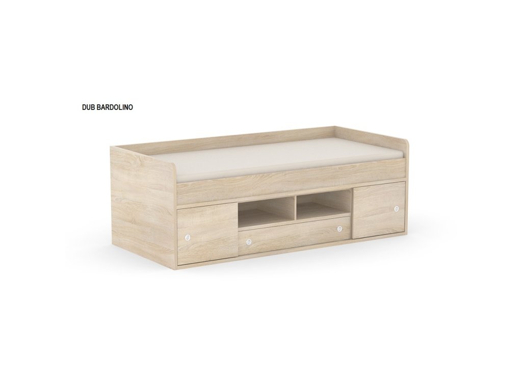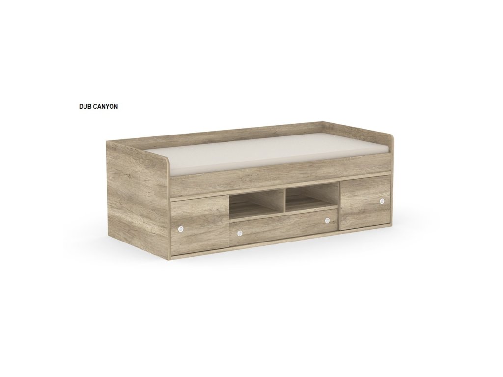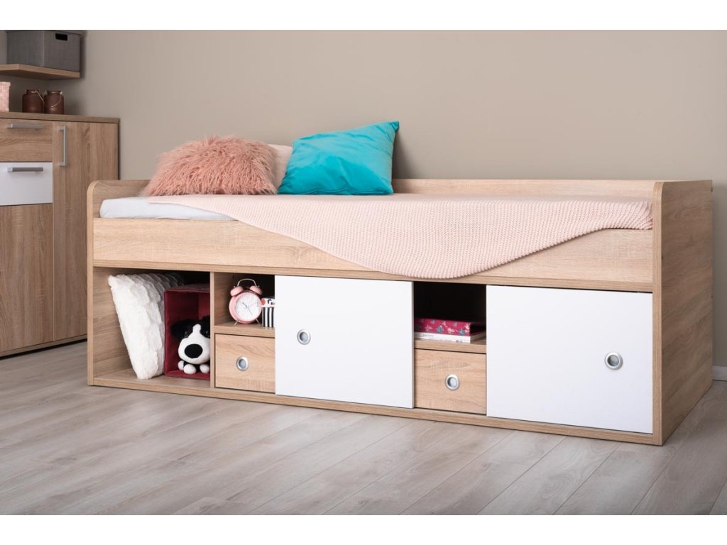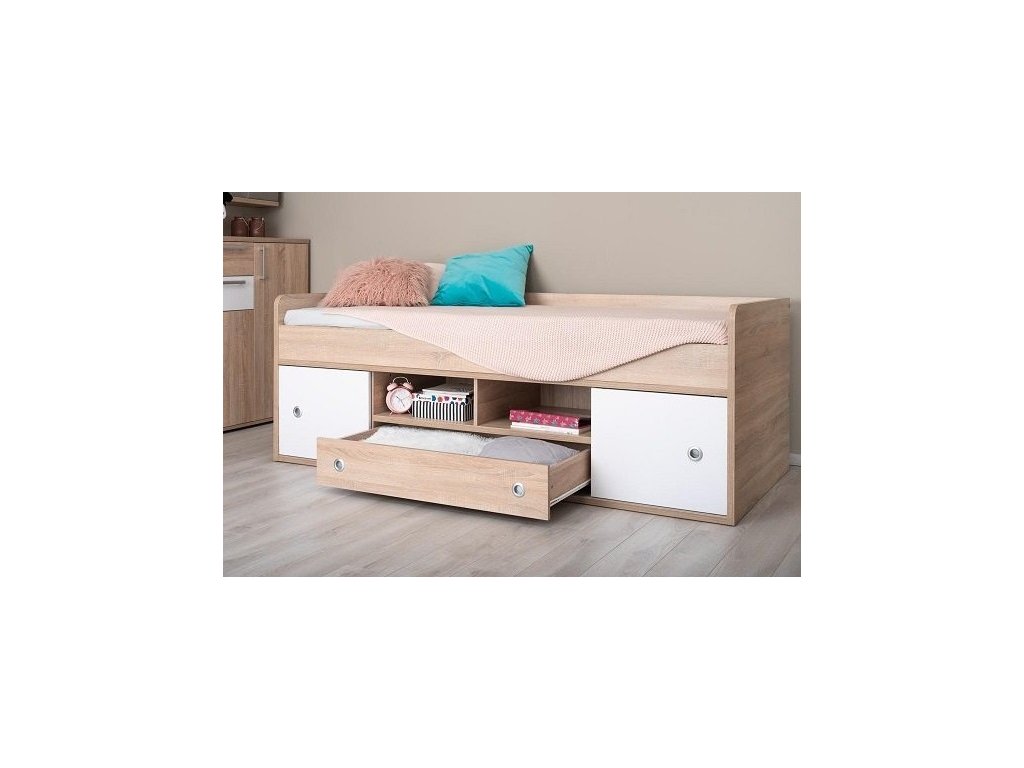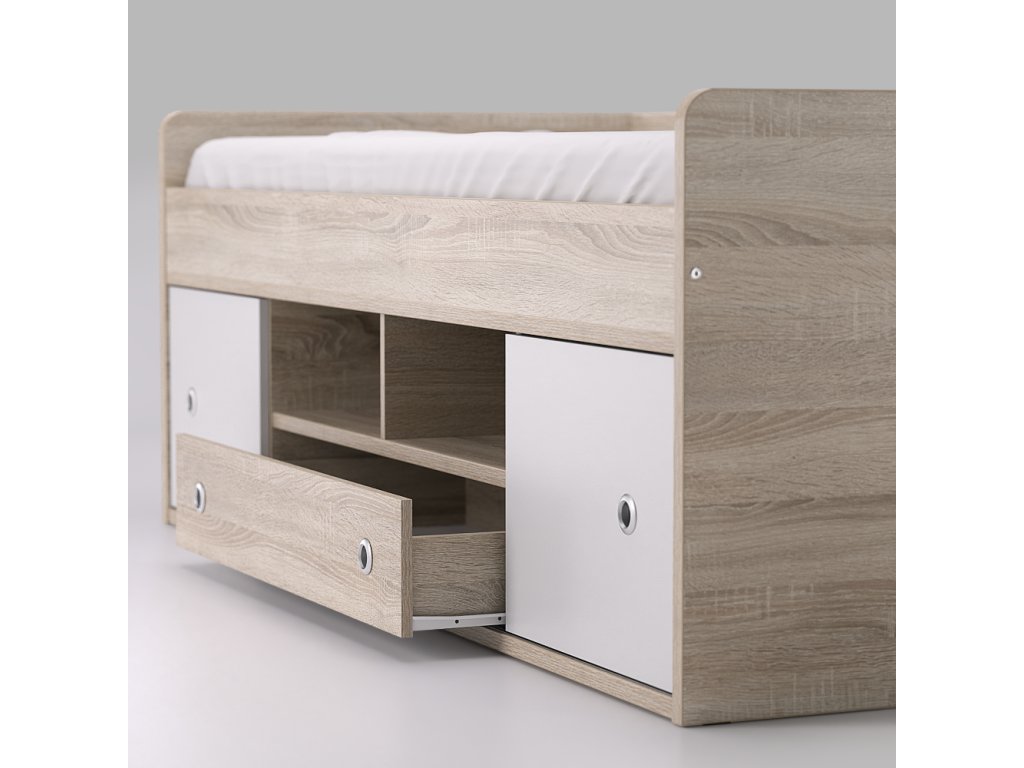 Kvalitné prevedenie dopĺňajú nízke postranné čelá tesne nad úrovňou lôžka so zaoblenými hranami, ktoré zvyšujú bezpečnosť pri používaní. Úložný priestor sa nachádza priamo pod lôžkom a tvorí ho zásuvka a sústava políc. Centrálne uložené police sú otvorené, kým bočné sú vybavené praktickými posuvnými čielkami, za ktoré jednoducho schováte všetko, čo nemá byť na očiach.