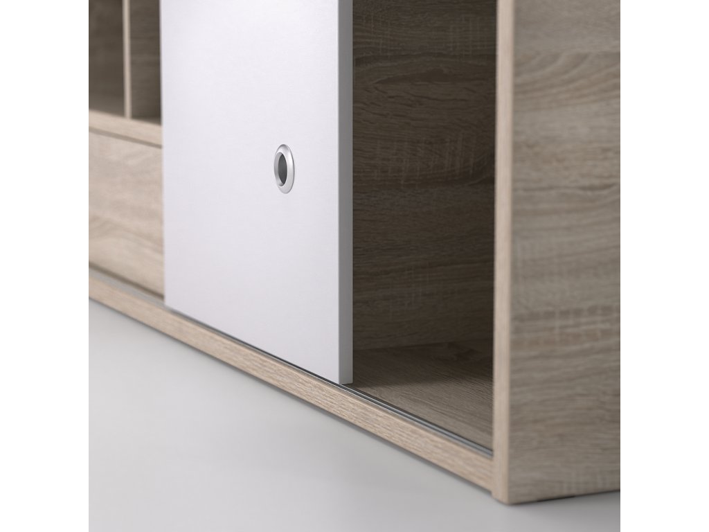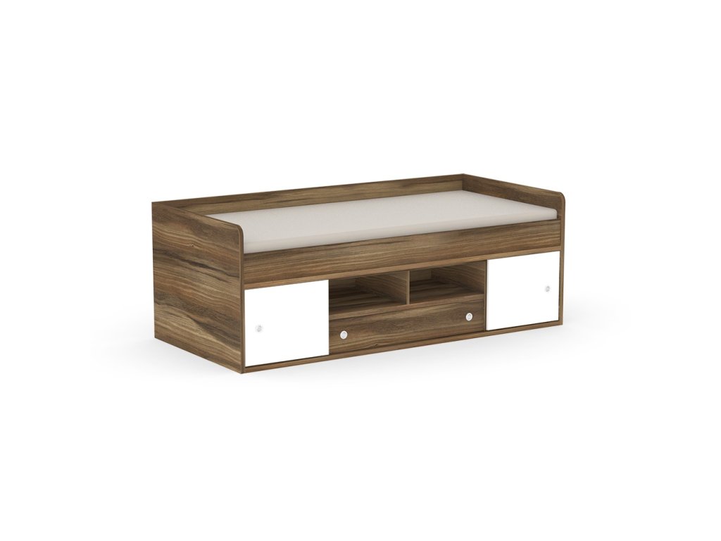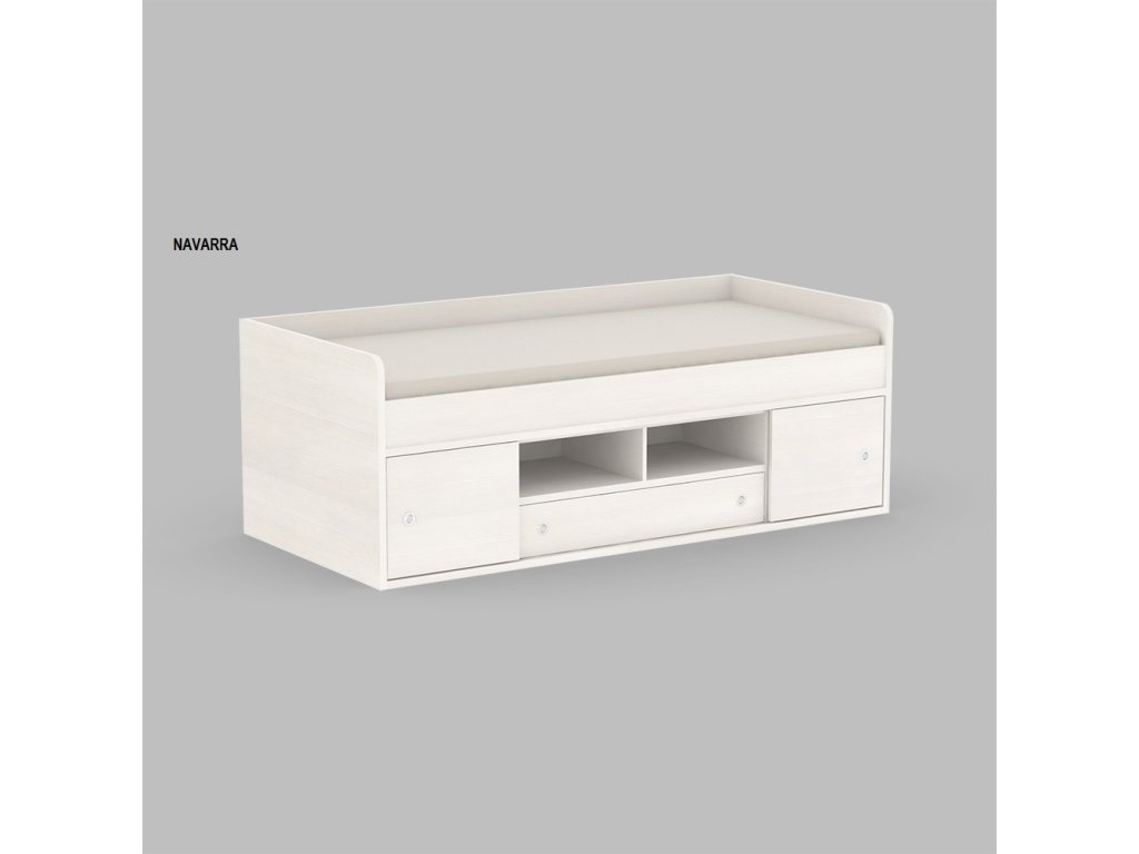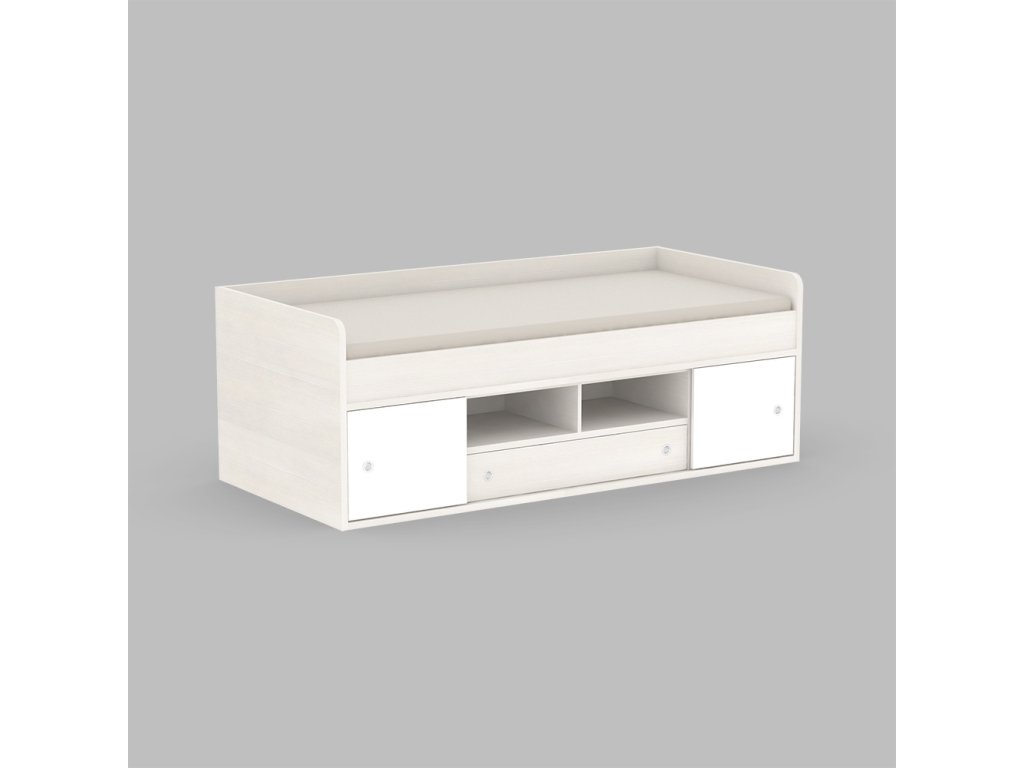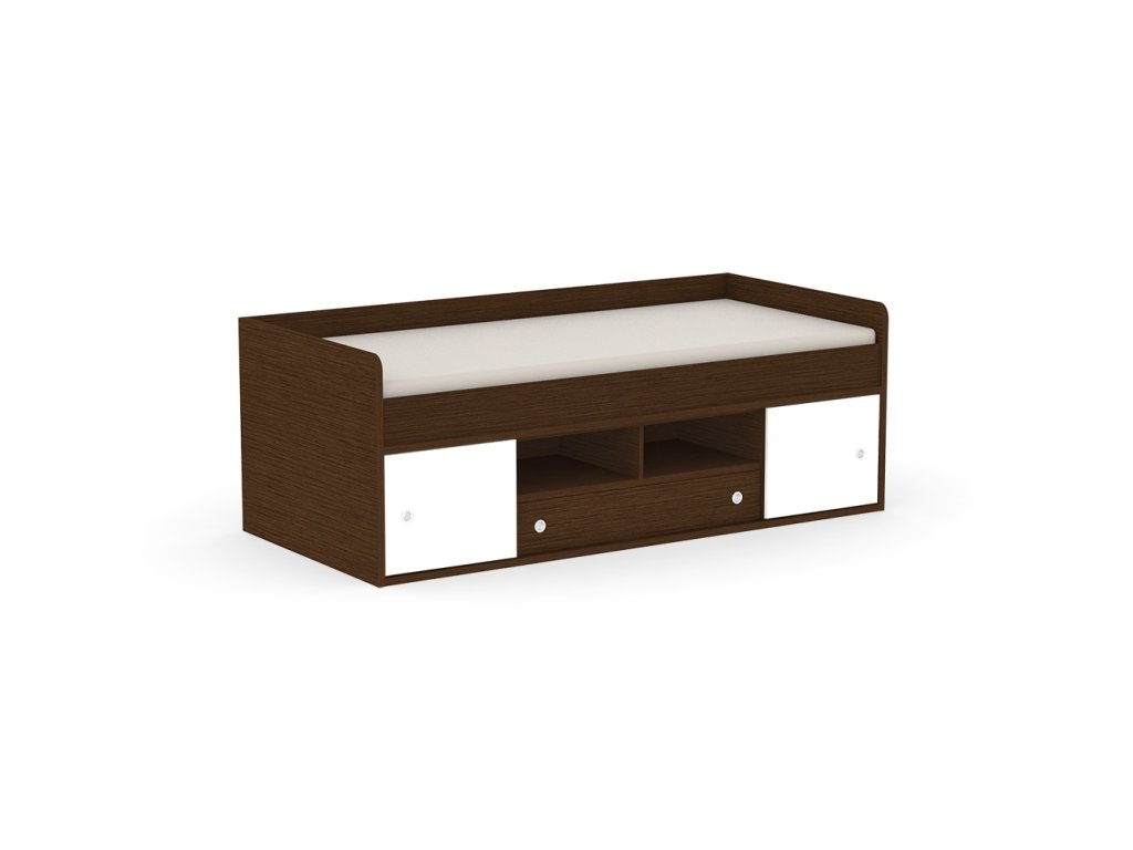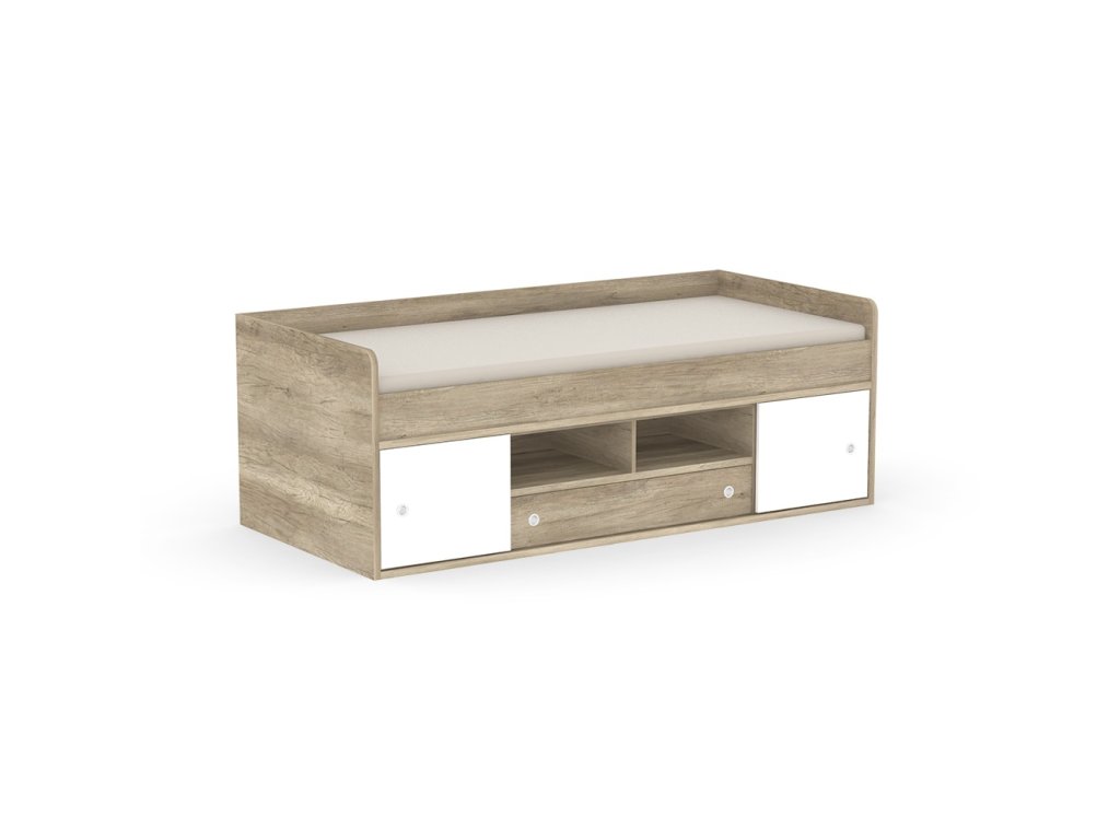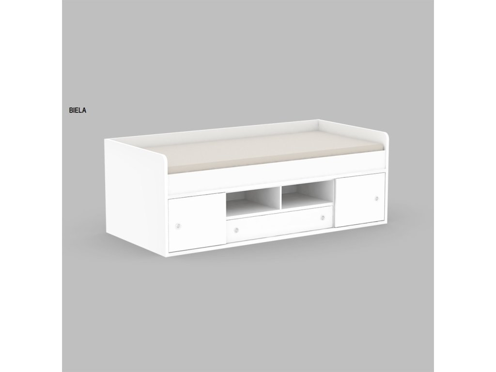 Kvalitné prevedenie dopĺňajú nízke postranné čelá tesne nad úrovňou lôžka so zaoblenými hranami, ktoré zvyšujú bezpečnosť pri používaní. Úložný priestor sa nachádza priamo pod lôžkom a tvorí ho zásuvka a sústava políc. Centrálne uložené police sú otvorené, kým bočné sú vybavené praktickými posuvnými čielkami, za ktoré jednoducho schováte všetko, čo nemá byť na očiach.